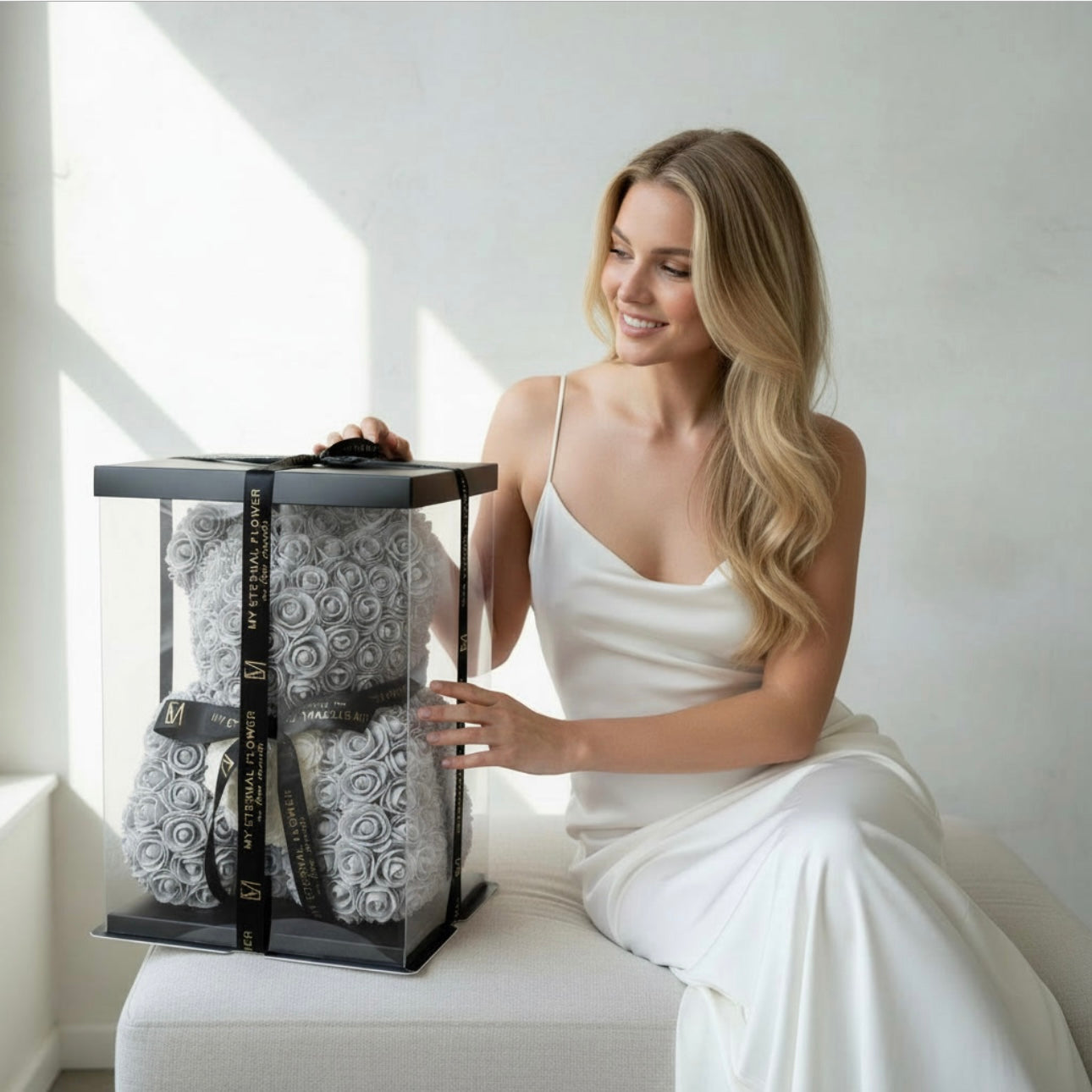 Every Luxe Rose Heart Bear 40cm includes a complimentary gift box and a My Eternal Flower signature greeting card (if message is included). All bears are available for delivery Australia-Wide and internationally.