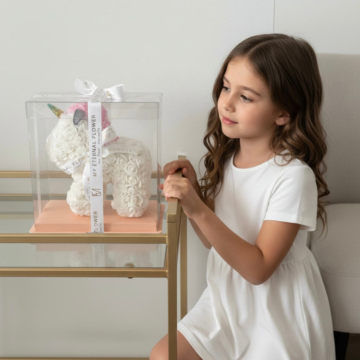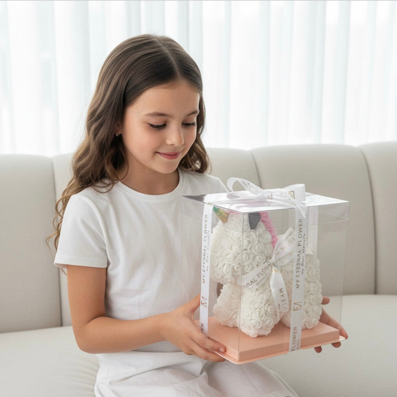 Every White Unicorn Rose Bear order includes a complimentary My Eternal Flower signature linen greeting card for your personalised message. Crafted from Styrofoam and covered in synthetic roses, 28 cm tall unicorn is designed to last with minimal maintenance. Order your White Unicorn Rose Bear today and bring a touch of magic to your loved one’s day!